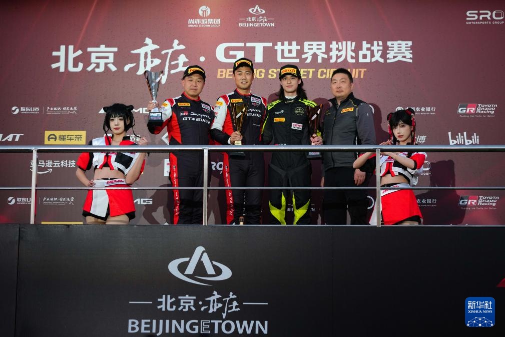 10月19日,本轮比赛Silver组别前三名丰田GAZOO中国车队中国车手韩坜潮(左三)、丰田GAZOO中国车队中国车手王浩(左二)、星速车队中国车手陆文虎(右三)在颁奖仪式上。