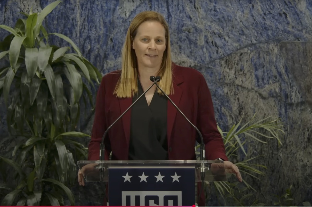 美国足协主席辛迪·帕洛·科恩在启动仪式上演讲