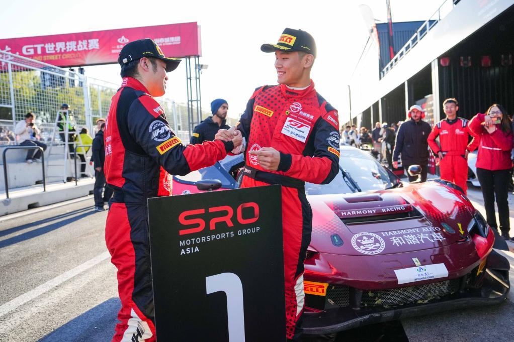 10月19日,主场胜地-和谐车队中国车手张亚琦/叶一飞(右)在颁奖仪式上庆祝。夺冠热门大瓜 黑料大瓜91新华社记者 郑焕松 摄