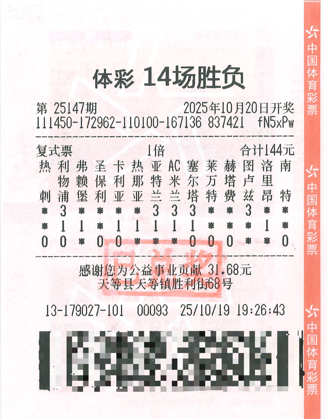 李先生表示,购彩是他观赛之余的乐趣所在。平时更常参与胜负任选9场游戏,偶尔尝试14场胜负玩法,此次中奖实属意外之喜。尽管热爱足彩,他始终秉持理性投注原则,依据自身情况合理规划购彩金额,并时常提醒身边友人量力而行。